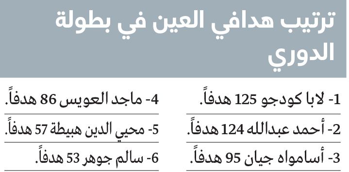 وكان أحمد عبدالله سجل 124 هدفاً بقميص العين في بطولة الدوري بين 1978 و1994، قبل أن يظل اسمه متربعاً على قمة قائمة الهدافين التاريخيين، حتى مساء أول من أمس، حين دوّن لابا كودجو الهدف رقم 125 بعد أن سجل ثلاثة أهداف «هاتريك» في شباك خورفكان.