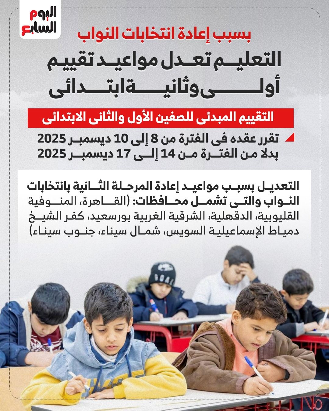 أوضحت أنه إيماء إلى مواعيد إعادة المرحلة الثانية بـ انتخابات مجلس النواب والتي تشمل 13 محافظة وهي القاهرة، المنوفية، القليوبية، الدقهلية، الشرقية الغربية بورسعيد، كفر الشيخ، دمياط الإسماعيلية السويس، شمال سيناء، جنوب سيناء، فإنه فيما يخص التقييم المبدئي للصفين الأول والثاني الابتدائي والذي كان من المقرر عقده في الفترة من 14 إلى 17 ديسمبر 2025 طبقاً للخريطة الزمنية للعام الدراسي ٢٠٢٦/٢٠٢٥ فقد تقرر عقده في تلك المديريات في الفترة من 8 الى 10 ديسمبر 2025.