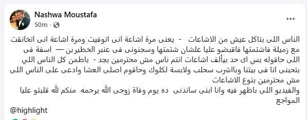 وقالت نشوى مصطفى، خلال برنامجها المعروض على قناة cbc سفرة: الحقيقة أنا مش عارفة أبتدي الحلقة النهارده إزاي، فيه التزامات، فالحياة بتجبرنا على إن إحنا لازم نشتغل، وأنا ما كنتش عايزة أكون موجودة النهارده علشان أنا ما بحبش أزعج حضراتكم بشيء شخصي، فسامحوني وهحاول أتماسك قدر استطاعتي، ومن فضلكم اللي بيحب ربنا لو سمحتوا ادعوا لزوجي بالرحمة.