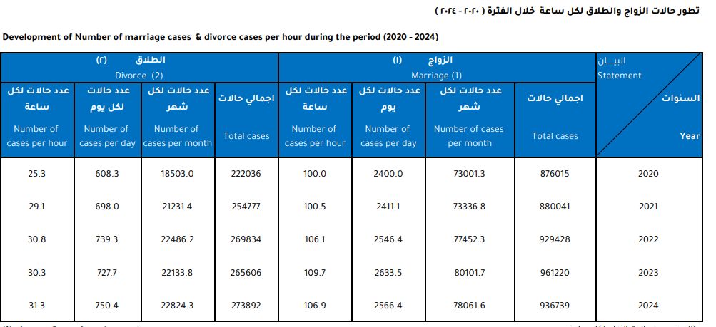 وقالت البيانات، إنه فى المقابل بلغ عدد حالات الطلاق لكل ساعة 31.3 حالة طلاق لعام 2024، مقابل 25.3 حالة طلاق عام 2020، بمتوسط ارتفاع بلغ 6.9 حالة في الساعة.