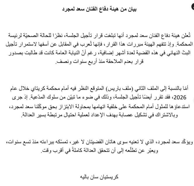 وتابع البيان: أما بالنسبة إلى الملف الثاني (ملف باريس) المتوقع النظر فيه أمام محكمة كريتاي خلال عام 2026، فقد تقرر أيضاً تأجيل الجلسة، وذلك في ضوء ما تبيّن من سلوك المدّعية، إذ جرى استدعاؤها للمثول أمام المحكمة على خلفية اتهامها بمحاولة الابتزاز بحق موكلنا سعد لمجرد، وبالاشتراك في تشكيل عصابة بهدف الإعداد لعملية احتيال مرتبطة بسير العدالة.