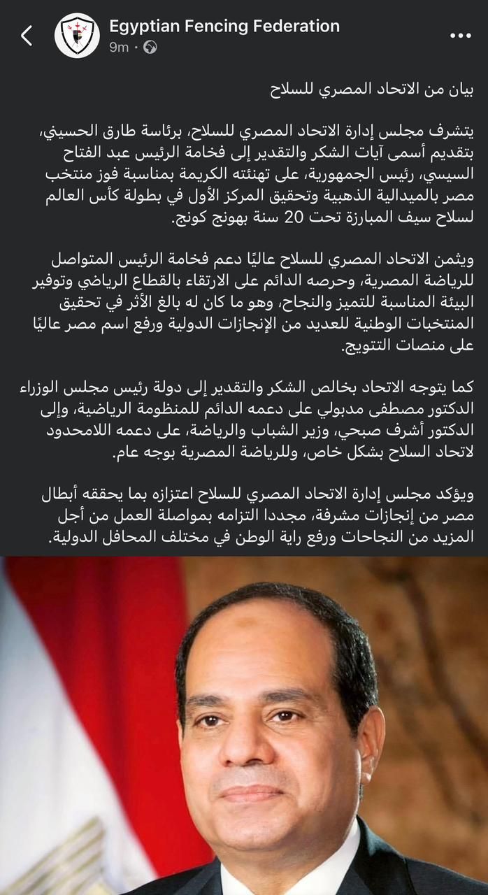 يتشرف مجلس إدارة الاتحاد المصري للسلاح، برئاسة طارق الحسيني، بتقديم أسمى آيات الشكر والتقدير إلى فخامة الرئيس عبد الفتاح السيسي، رئيس الجمهورية، على تهنئته الكريمة بمناسبة فوز منتخب مصر بالميدالية الذهبية وتحقيق المركز الأول في بطولة كأس العالم لسلاح سيف المبارزة تحت 20 سنة بهونج كونج.