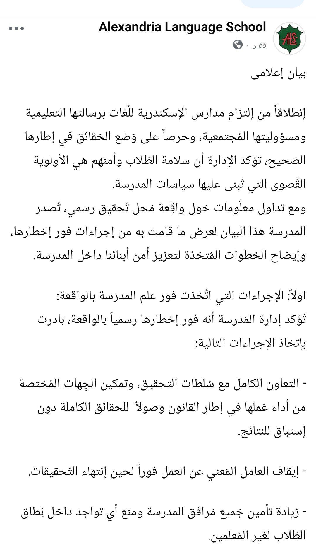 إنطلاقاً من إلتزام مدارس الإسكندرية للُغات برسالتها التعليمية ومسؤوليتها المُجتمعية، وحرصاً على وَضع الحَقائق في إطارها الصَحيح، تؤكد الإدارة أن سلامة الطُلاب وأمنهم هي الأولوية القُصوى التي تُبنى عليها سياسات المدرسة.