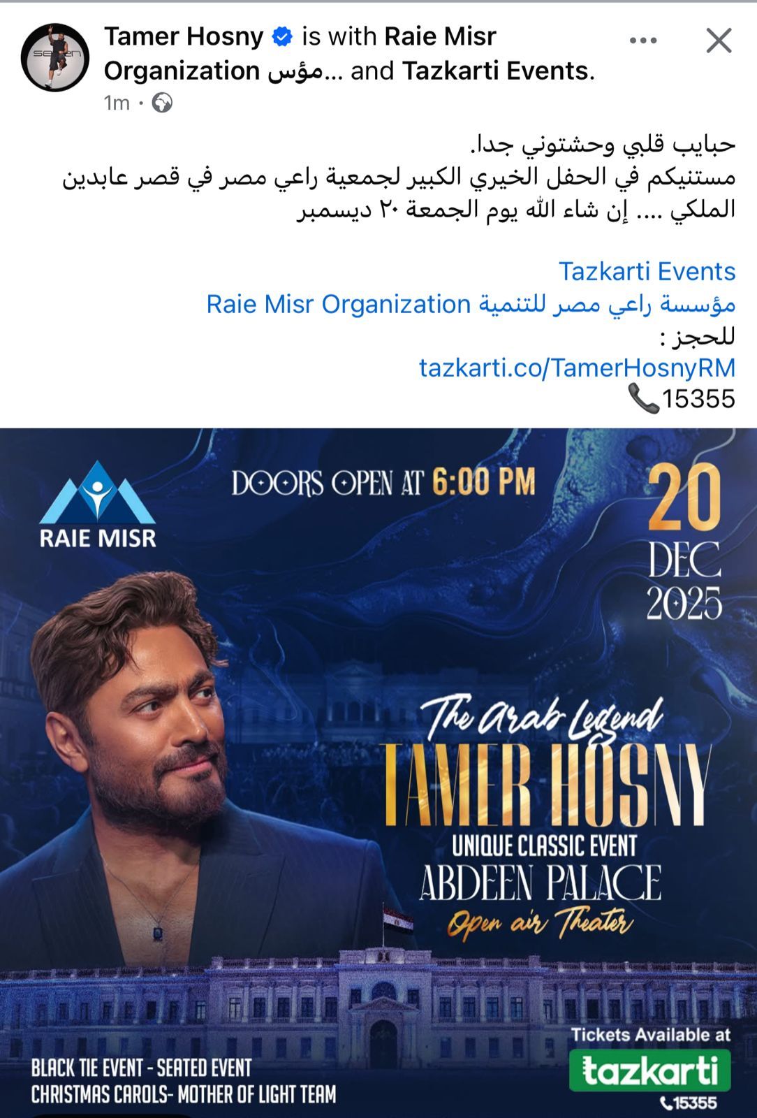روج الفنان تامر حسني من خلال حسابه على موقع فيس بوك لحفله المقبل، وكتب: "مستنيكم في الحفل الخيري الكبير لجمعية راعي مصر، في قصر عابدين الملكي إن شاء الله يوم الجمعة 20 ديسمبر".