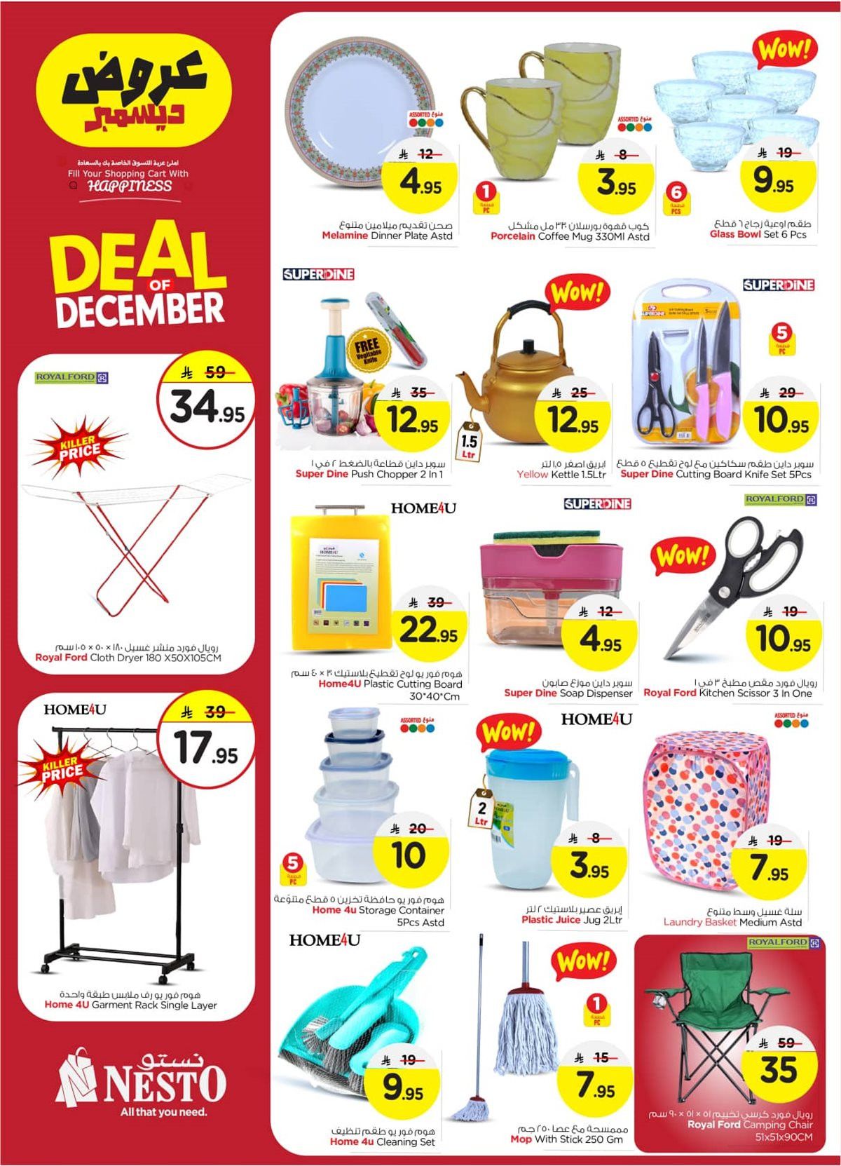 عروض نستو الرياض الأربعاء 3 ديسمبر 2025 تضم مجموعة غذائية تشمل الطماطم البيضاويـة والبطاطس الكبيرة والخيار الرفيع والتفاح الأحمر واليوسفي الحلو مع الجبن الكريمي وقطع الدجاج ثم تشمل الأجهزة المنزلية محضرة صوص كهربائية وصانع وافل منزلي وفرن صغير بخاصية التحميص ومطحنة قهوة وخلاط يدوي .