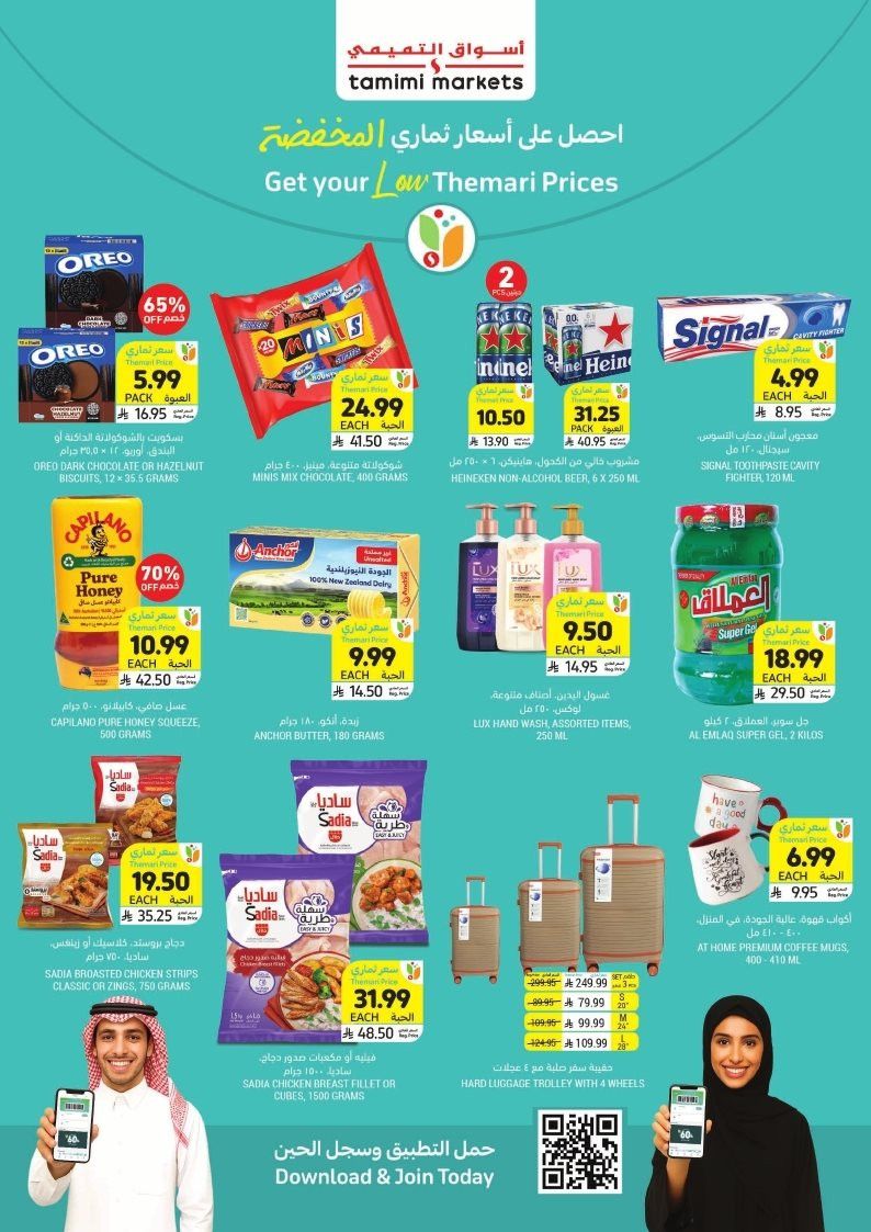 عروض التميمي الأسبوعية الأربعاء 3 ديسمبر 2025 تضم مجموعة غذائية تشمل البطاطس الصفراء والبطاطا الحلوة والطماطم الحمراء والخيار الرفيع والتفاح الأصفر مع الجبن الأبيض وشرائح الدجاج المقرمش والفطائر الجاهزة ثم تشمل الأجهزة المنزلية محضر شوربة كهربائي ومطحنة قهوة صغيرة وصانع وافل منزلي وفرن صغير للطهي السريع