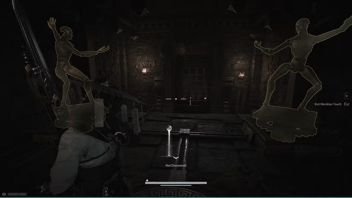 لحل هذا اللغز، ابقَ واقفًا على الترس حتى يصبح التمثال الأيسر مواجهًا لنفس الاتجاه الذي ينظر إليه التمثال الأيمن، ثم استخدم مهارةMeridian Touch لتجميده في مكانه وفتح الباب أمامك.