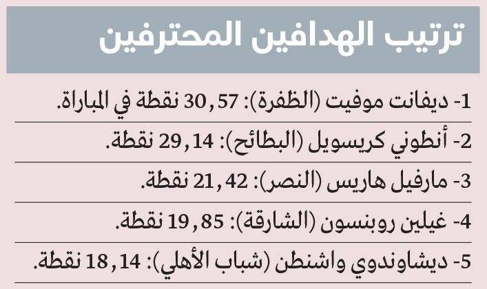 وقادت مهارة موفيت ونِسَب تسجيله الناجحة على صعيدي الرميات الثنائية والثلاثية، إلى منحه الصدارة وأن يكون المحترف الوحيد الذي نجح في تخطي حاجز معدل 30 نقطة في المباراة الواحدة، متفوقاً على محترف البطائح الأميركي، أنطوني كريسويل، الذي حل في المرتبة الثانية مع نهاية مرحلة الذهاب بمعدل 29.14 نقطة في المباراة الواحدة، بينما جاء محترف النصر الأميركي مارفيل هاريس في المرتبة الثالثة بمعدل 21.42 نقطة في المباراة الواحدة، تلاه محترف الشارقة اللاعب السابق في الدوري الأميركي للمحترفين «إن بي إيه»، غيلين روبنسون، بمعدل 19.85 نقطة في المباراة الواحدة، واكتفى صانع ألعاب شباب الأهلي وهداف دوري الموسم الماضي، الأميركي ديشاوندوي واشنطن بالمركز الخامس بمعدل 18.14 نقطة في المباراة الواحدة.