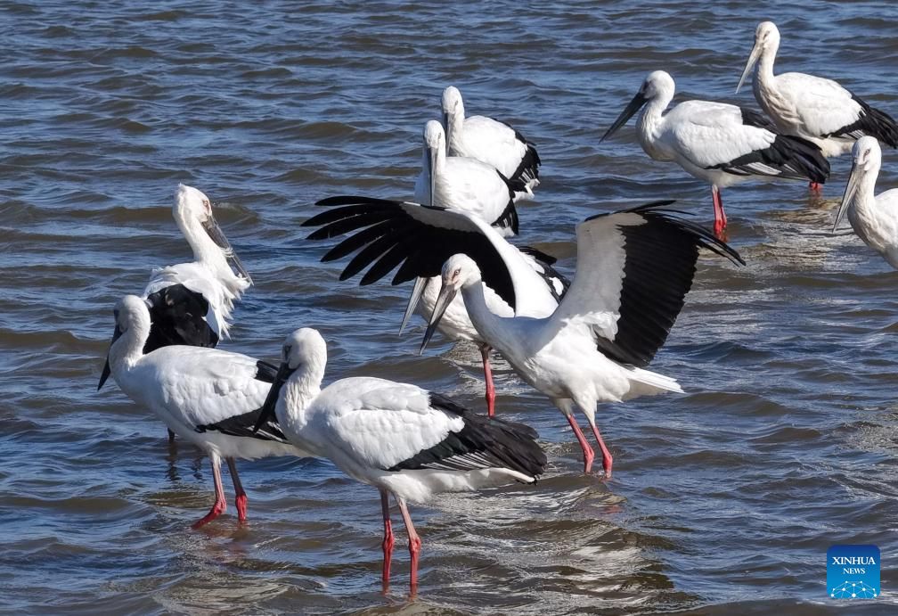 تُعد الأراضي الرطبة الساحلية في مدينة تانغشان مهبط للطيور المهاجرة، حيث أبرزت الكاميرا المسيرة رحلة هبوط طائر اللقلق الأبيض.