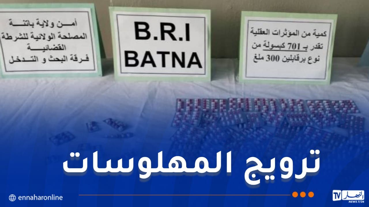 تمكن عناصر فرقة البحث والتدخلBRI بالمصلحة الولائية للشرطة القضائية بأمن ولاية باتنة، من توقيف شخص وحجز بحوزته كمية تقدر 701 قرص مهلوس بريغابالين 300ملغ.