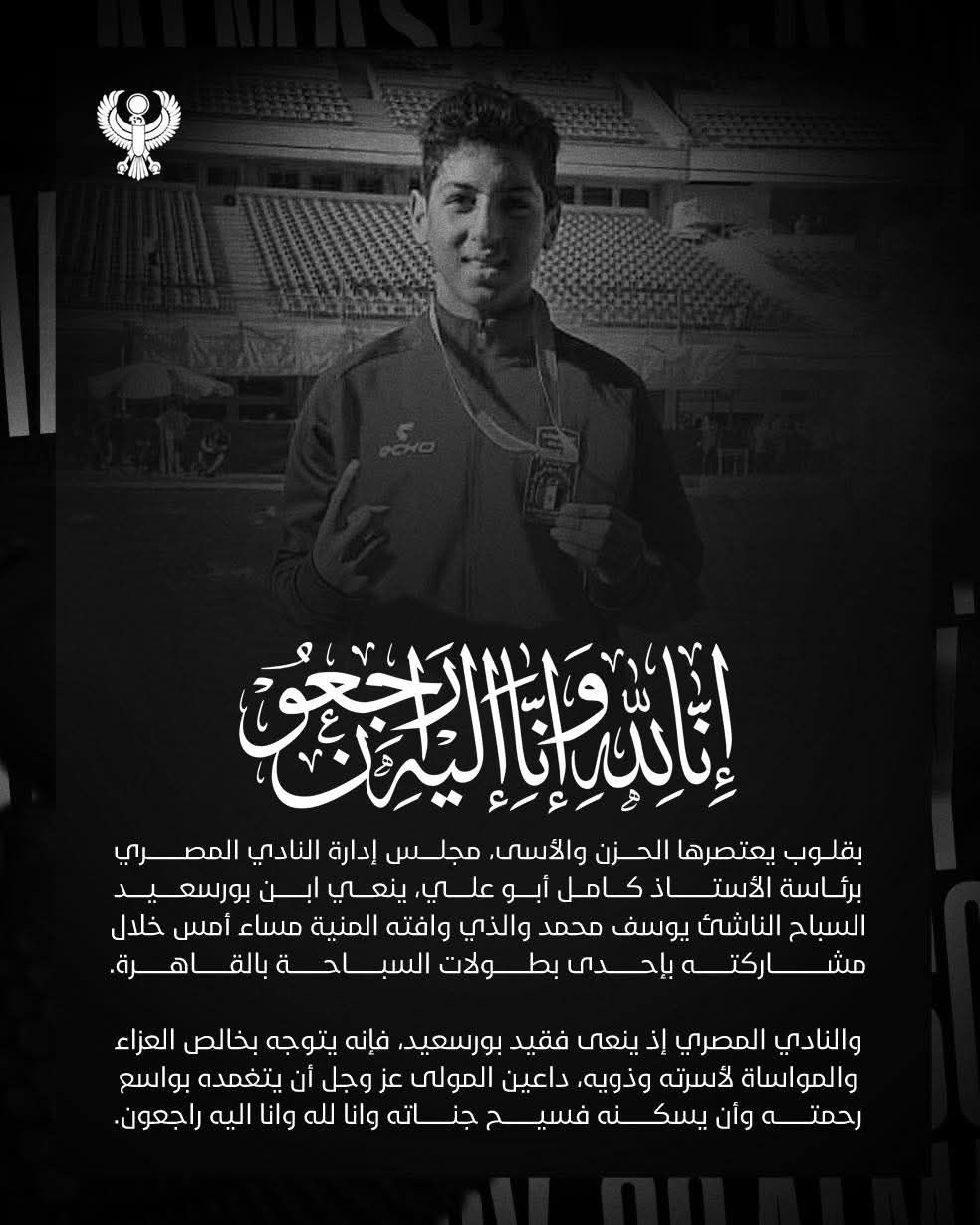 بيان المصريبقلوب يعتصرها الحزن والأسى، مجلس إدارة النادي المصري برئاسة كامل أبو علي ينعي ابن بورسعيد السباح الناشئ يوسف محمد والذي وافته المنية مساء أمس خلال مشاركته بإحدى بطولات السباحة بالقاهرة.