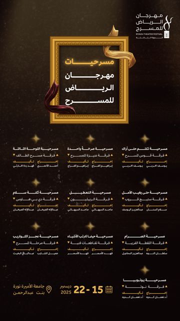 كشفت هيئة المسرح والفنون الأدائية عن أسماء العروض المسرحية المتأهلة للمشاركة في الدورة الثالثة من مهرجان الرياض للمسرح، الذي يُقام خلال الفترة من 15 إلى 22 ديسمبر المقبل في مركز المؤتمرات بجامعة الأميرة نورة بنت عبدالرحمن بالرياض.