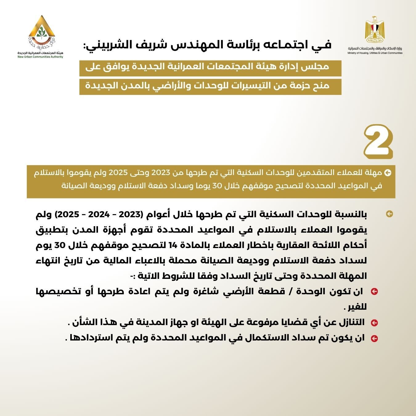 وبالنسبة للوحدات السكنية التي تم طرحها خلال أعوام (2023 – 2024 – 2025) ولم يقم العملاء بالاستلام في المواعيد المحددة تقوم أجهزة المدن بتطبيق أحكام اللائحة العقارية بإخطار العملاء بالمادة 14 لتصحيح موقفهم خلال 30 يوم لسداد دفعة الاستلام ووديعة الصيانة محملة بالأعباء المالية من تاريخ انتهاء المهلة المحددة وحتى تاريخ السداد وفقا للشروط الآتية :- أن تكون الوحدة شاغرة ولم يتم إعادة طرحها أو تخصيصها للغير، والتنازل عن أي قضايا مرفوعة على الهيئة أو جهاز المدينة في هذا الشأن، وأن يكون تم سداد الاستكمال في المواعيد المحددة ولم يتم استردادها .