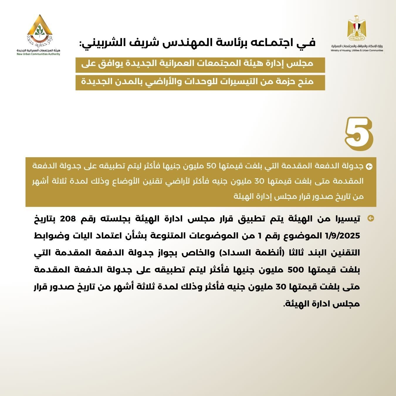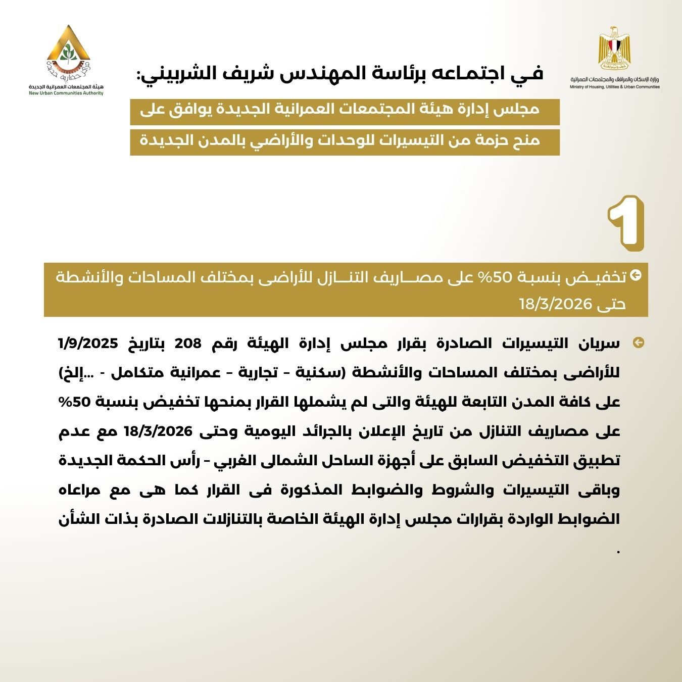 وتضمنت الموافقة على سريان التيسيرات الصادرة بقرار مجلس إدارة الهيئة رقم 208 بتاريخ 1/9/2025 للأراضى بمختلف المساحات والأنشطة (سكنية – تجارية – عمرانية متكامل - ...إلخ) على كافة المدن التابعة للهيئة والتى لم يشملها القرار بمنحها تخفيض بنسبة 50% على مصاريف التنازل من تاريخ الإعلان بالجرائد اليومية وحتى 18/3/2026 مع عدم تطبيق التخفيض السابق على أجهزة الساحل الشمالى الغربي – رأس الحكمة الجديدة وباقى التيسيرات والشروط والضوابط المذكورة فى القرار كما هى مع مراعاه الضوابط الواردة بقرارات مجلس إدارة الهيئة الخاصة بالتنازلات الصادرة بذات الشأن .