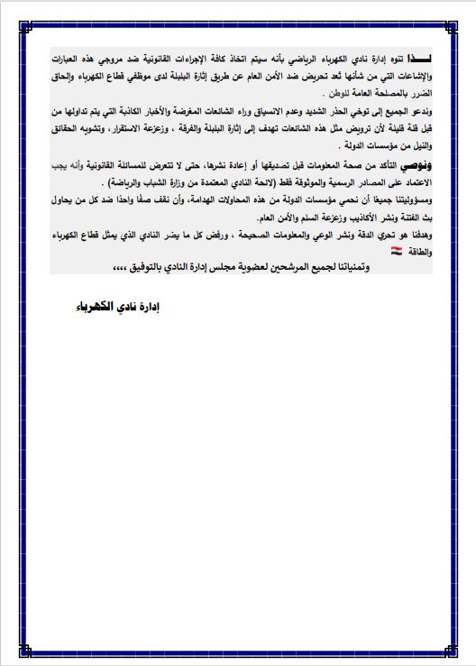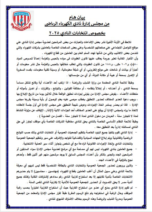 وجاء بيان نادي كهرباء القاهرة كالتالي: