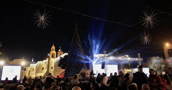 أضيأت شجرة عيد الميلاد، في ساحة كنيسة المهد بمدينة بيت لحم في الضفة الغربية، بحضور عدد من رجال الدين والمسؤولين والدبلوماسيين والمواطنين والسياح من زوار المدينة إيذانا ببدء الاحتفالات بعيد الميلاد.