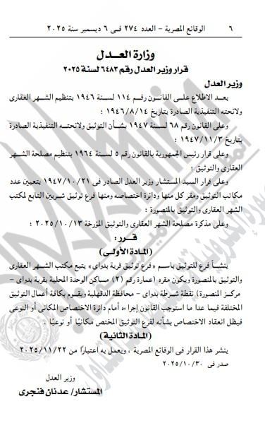 الأحد، 07 ديسمبر 2025 09:56 صنشرت الجريدة الرسمية قرار وزير العدل رقم 6483 لسنة 2025، بشأن إنشاء فرع للتوثيق باسم "فرع توثيق قرية بدواي"، يتبع مكتب الشهر العقاري والتوثيق بالمنصورة ويكون مقرة عمارة رقم 2 مساكن الوحدة المحلية بقرية بدواي ـ مركز المنصورة، محافظة الدقهلية، ويقوم بكافة أعمال التوثيق المختلفة عدا ما استوجب القانون إجراءه أمام دائرة الاختصاص المكاني أو النوعي فيظل انعقاد الاختصاص.