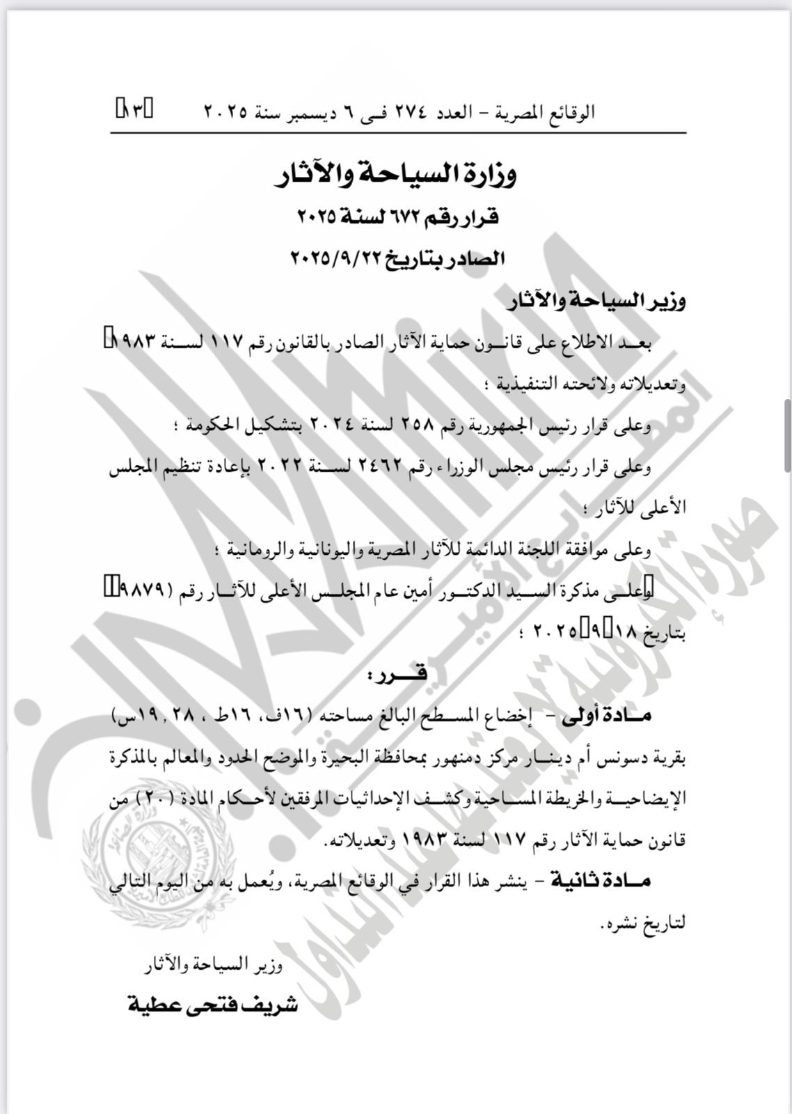 نشرت الجريدة الرسمية قرار وزير السياحة والآثار، شريف فتحي، رقم 727 لسنة 2025 بإخضاع السطح البالغ مساحته (16م × 161م × 28م × 19م) بقرية دسنوس – زمام مركز دمنهور – محافظة البحيرة، والواضح الحدود والمعالم بالمذكرة الإيضاحية، لخطط المساحة وكيفية الإحداثيات الواردة لأحكام المادة (20) من قانون حماية الآثار رقم 117 لسنة 1983 وتعديلاته.