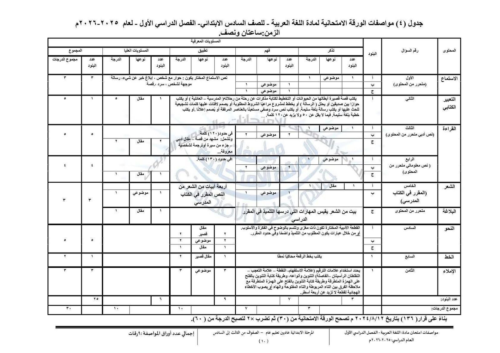 وأوضحت وزارة التربية والتعليم مواصفات الورقة الامتحانية اللغة العربية امتحان نصف العام المرحلة الابتدائية الصفوف: الرابع، الخامس، السادس 2025/2026 :-