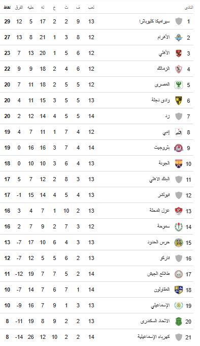 يتصدر فريق سيراميكا جدول بطولة الدوري برصيد 29 نقطة بعدما خاض 13 مباراة، فيما يأتي بيراميدز في المركز الثاني برصيد 27 نقطة بعد خوض 12 مباراة، ويليه الأهلي في المركز الثالث برصيد 23 نقطة بعد خوض 12 جولة، ثم الزمالك رابعاً برصيد 22 نقطة بعد خوض 12 جولة.