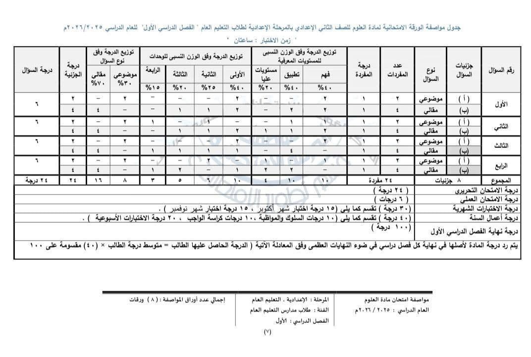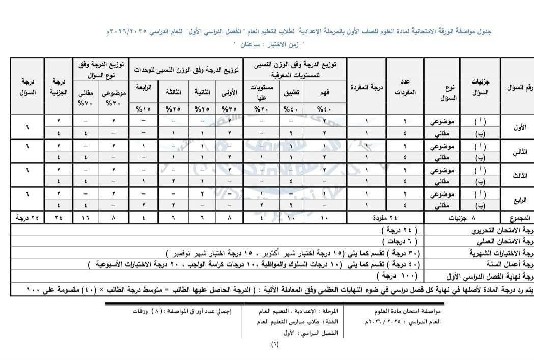 الأحد، 07 ديسمبر 2025 04:14 محددت وزارة التربية والتعليم والتعليم الفني، مواصفة امتحان العلوم للصفين الأول والثاني الإعدادي الفصل الدراسي الأول للعام الدراسي الحالي 2025/2026، حيث كشفت عدد الأسئلة والدرجات وعدد الأسئلة المقالية والموضوعية، وأن نسبة الأسئلة المقالية 70% والأسئلة الموضوعية 30%.