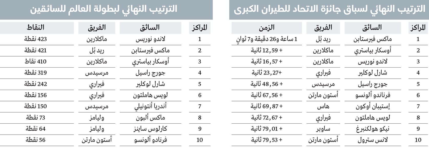 وحسمت جولة أبوظبي اللقب الأخير في الموسم على صعيد بطولة العالم للسائقين، بعد أن عزز السائق البريطاني لاندو نوريس صدارته لبطولة العالم بإجمالي 423 نقطة، متفوقاً بفارق نقطتين فقط عن ماكس فيرستابن الذي أنهى موسمه الحالي بالمركز الثاني بإجمالي 421 نقطة، فيما أنهى سائق «ماكلارين» أوسكار بياسري الموسم في المركز الثالث برصيد 410 نقاط.