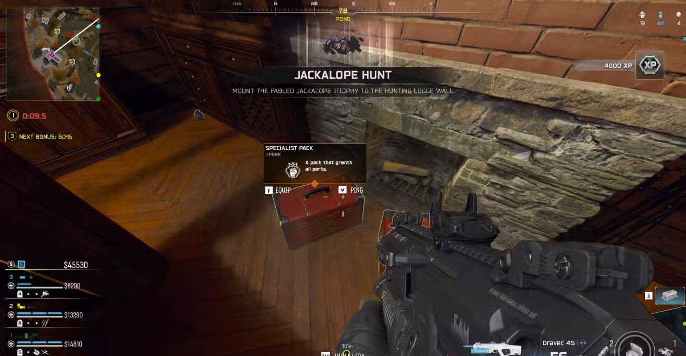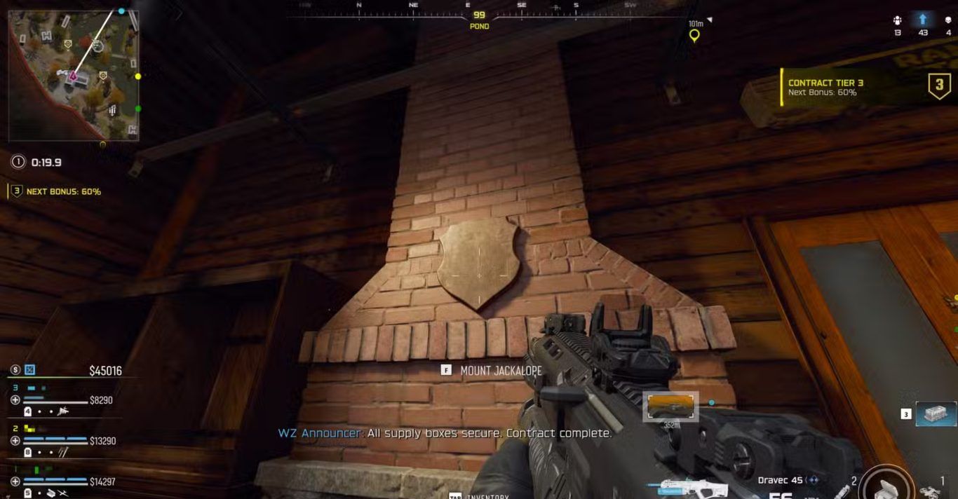 بعد تثبيت Jackalope داخل Hunting Lodge ستحدث لحظة التفعيل الأساسية في هذا اللغز إذ ينفتح المسار السري للمكافآت بشكل مباشر من خلال المدفأة الموجودة أسفل الحامل مباشرة ويسقط منها Specialist Package وهو واحد من أقوى العناصر في Warzone لأنه يمنح اللاعب جميع الـ Perks في اللعبة دفعة واحدة مما يغيّر أسلوب اللعب بالكامل ويحوّل اللاعب إلى نسخة معززة من قدراته الطبيعية ويجعله أكثر قدرة على النجاة والمواجهة داخل خريطة Haven’s Hollow ومعارك Resurgence السريعة
