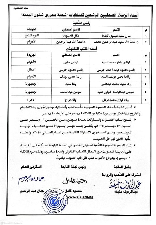 4- يُفتح باب الطعون، والتنازلات لمدة يومين، من الخميس 11 ديسمبر حتى السبت 13 ديسمبر 2025م، وتُعلن بعد ظهر اليوم الأخير الكشوف النهائية للمرشحين، وهم المسددون لاشتراك النقابة عن العام الحالي 2025م، وأعضاء الشُّعبة، الذين لهم حق التصويت.
