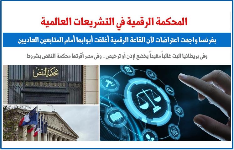 المحكمة الرقمية في التشريعات العالمية.. بفرنسا واجهت اعتراضات لأن القاعة الرقمية أغلقت أبوابها أمام المتابعين العاديين.. وفى بريطانيا البث غالباً مقيداً يخضع لإذن أو ترخيص.. وفى مصر أقرتها محكمة النقض بشروط