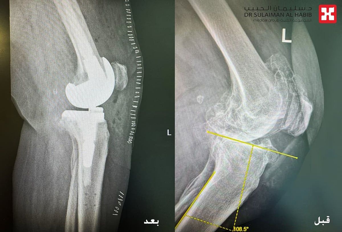 موضحاً بأنه بعد الإنتهاء من دراسة كافة نتائج الفحوصات، تم إتخاذ القرار بالتدخل الجراحي، مشيراً إلى أن العملية استغرقت ساعتين ونصف تحت التخدير الجزئي، وتم فيها استخدام تقنية الروبوت الجراحي المتطور، والذي تم تزويده بالمعلومات الخاصة بالمراجعة، حيث يقوم الروبوت برفع قياسات مفصل الركبة بشكل دقيق، وتحديد المفصل الصناعي المناسب، مما يمنح الحالة نتائج عالية الدقة، وبما يتناسب مع بنية الركبة والأنسجة المحيطة بها، كما تم تعديل إنحراف وتقوس الركبة من خلال استخدام دعامة متطورة بالساق والفخذ.