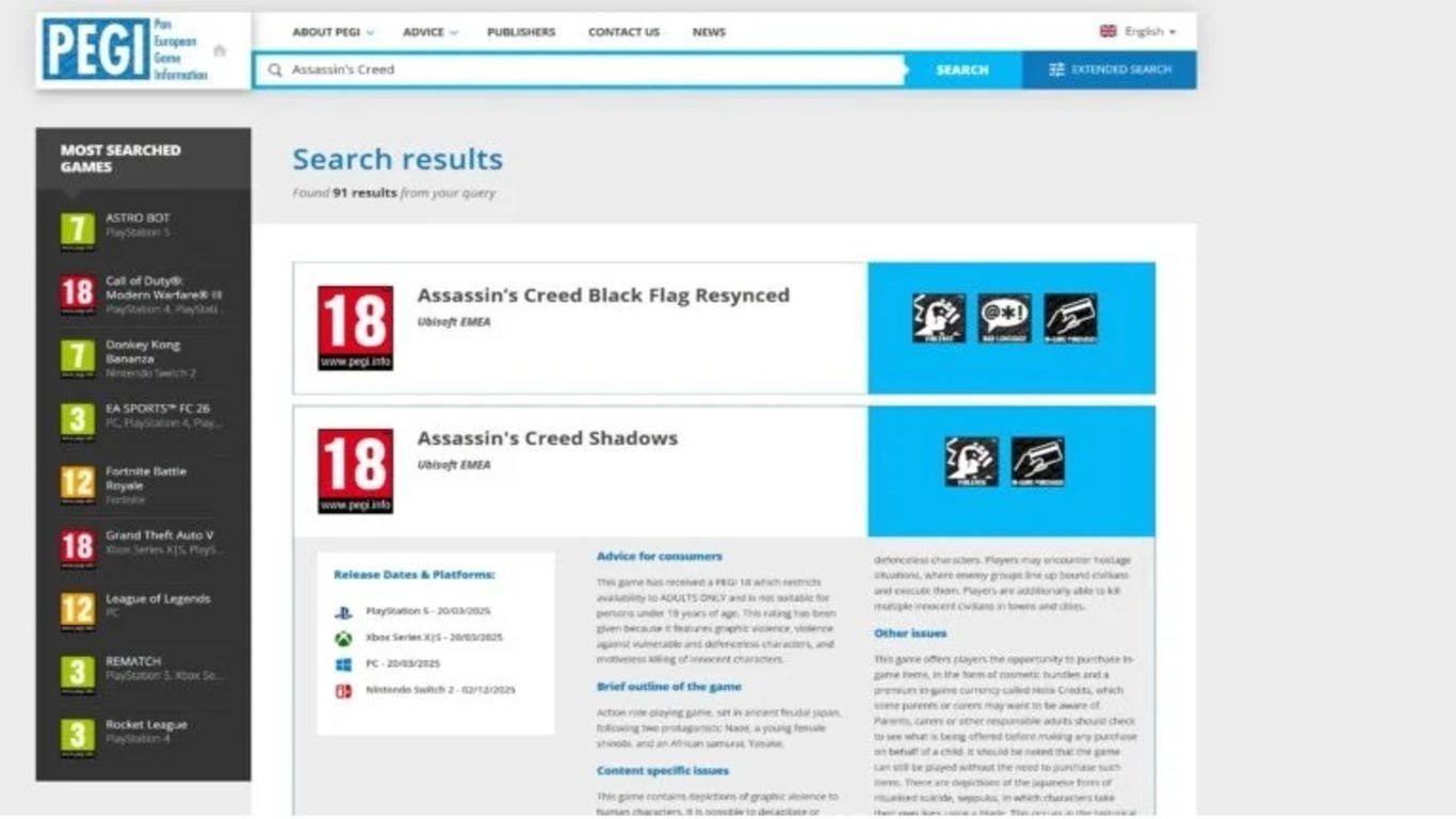 عند البحث عن اسم Assassin’s Creed على موقع PEGI، تظهر قائمة جديدة تحمل عنوان ريميك Assassin’s Creed Black Flag . لا تتضمن القائمة أي تفاصيل عن المنصات التي ستصدر عليها اللعبة، بينما تشير فقط إلى تصنيف PEGI 18، مع وسوم تُحذر من وجود العنف واللغة البذيئة والمشتريات داخل اللعبة.