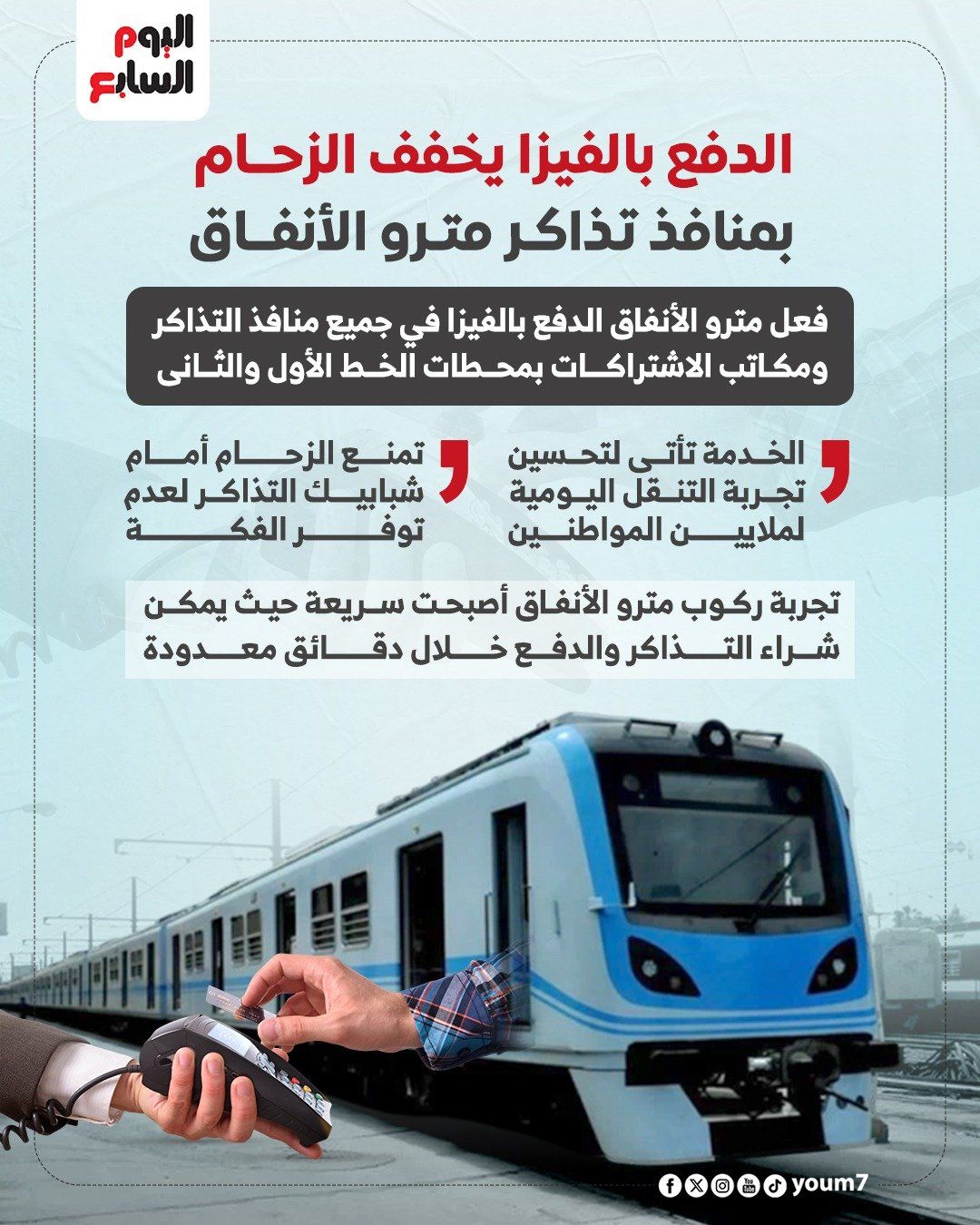 تسهيل الدفع للركاب: الدفع الإلكتروني بالفيزا متاح في جميع منافذ التذاكر ومكاتب الاشتراكات بالخطين الأول والثاني.