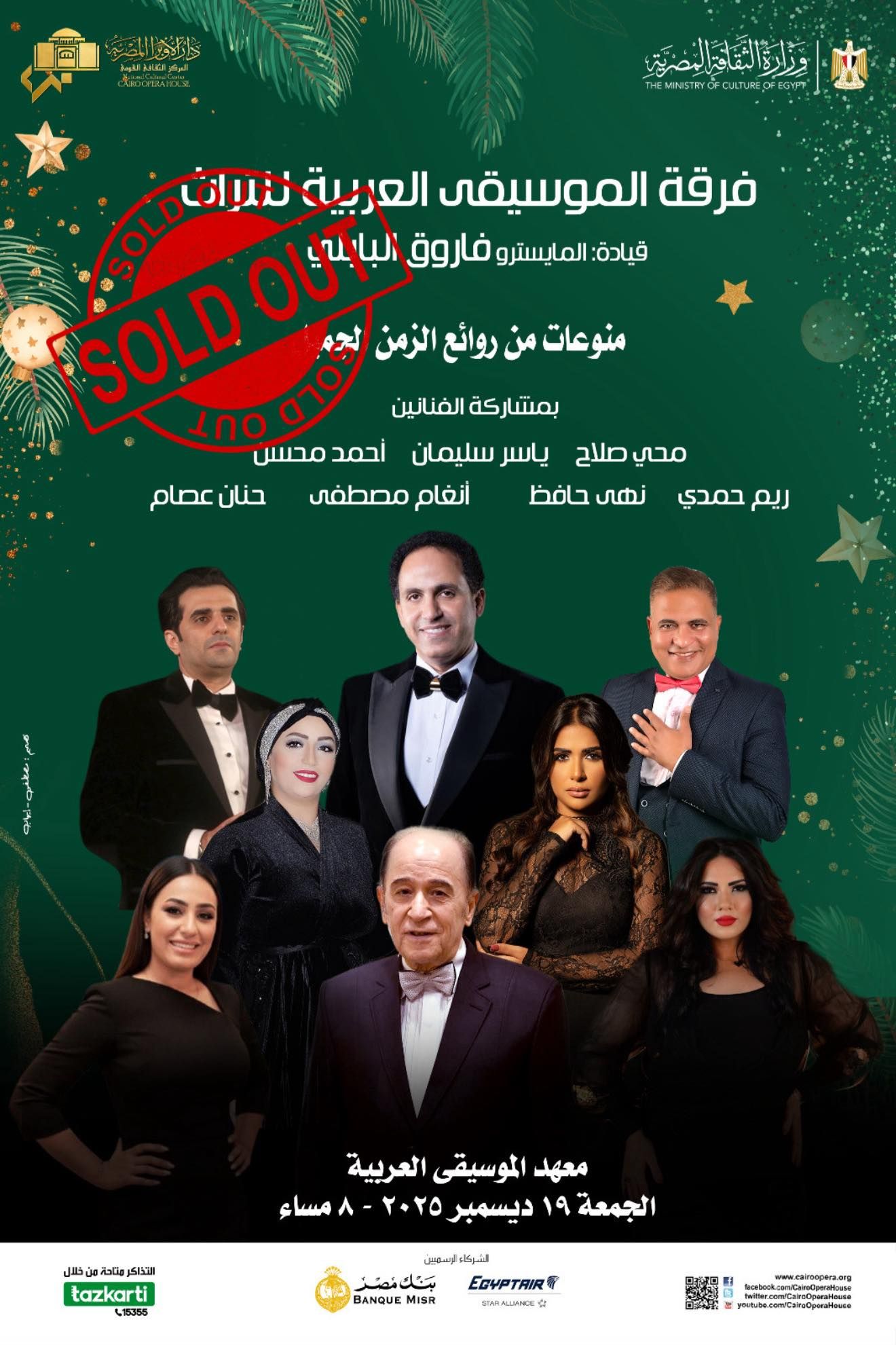 أعلنت دار الأوبرا المصرية برئاسة د. علاء عبد السلام عن نفاد جميع تذاكر الحفل الفني الذي تقيمه الفرقة الموسيقية العربية للتراث، بقيادة المايسترو فاروق البابلى، والمقرر انعقاده يوم الجمعهة الموافق 19 ديسمبر الجارى على مسرح معهد الموسيقى العربية، ضمن فعاليات وزارة الثقافة في التاسعة مساء.ويشارك فيها النجوم احمد محسن ، ياسر سليمان ، محى صلاح، انغام مصطفي ، نهى حافظ ، حنان عصام ، ريم حمدى