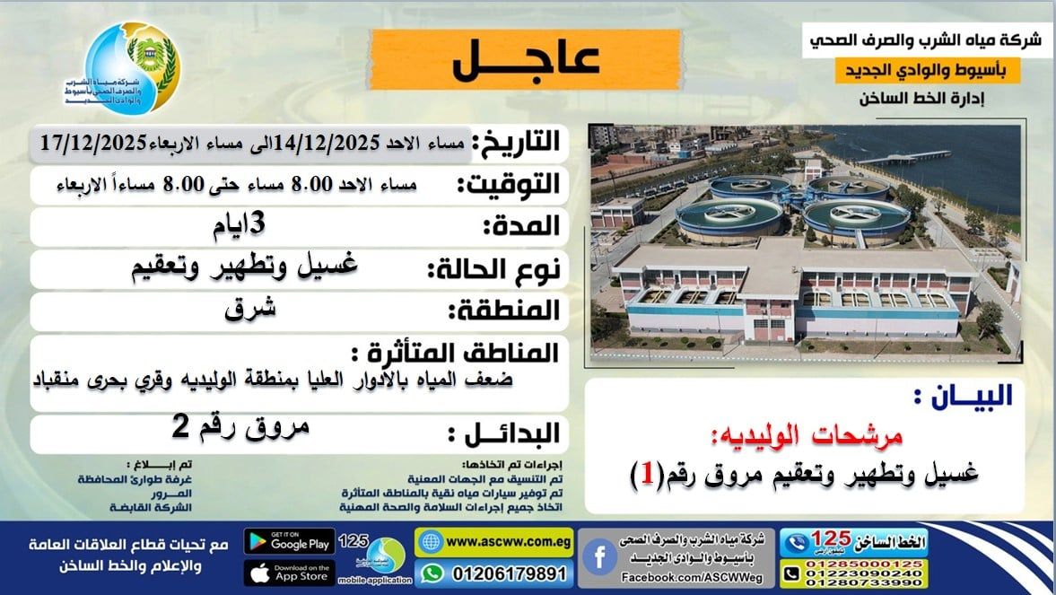 المناطق المتأثرةوأشار رئيس الشركة إلى أن هذه الأعمال قد ينتج عنها ضعف المياه بالأدوار العليا خلال أوقات الذروة بمنطقة شرق الوليدية، وكذلك ببعض قرى بحري مركز أسيوط، وهي: منقباد، نجع سبع، وبني حسين، مؤكدًا أن الهدف الأساسي من تلك الإجراءات هو ضمان جودة المياه المقدمة للمواطنين.