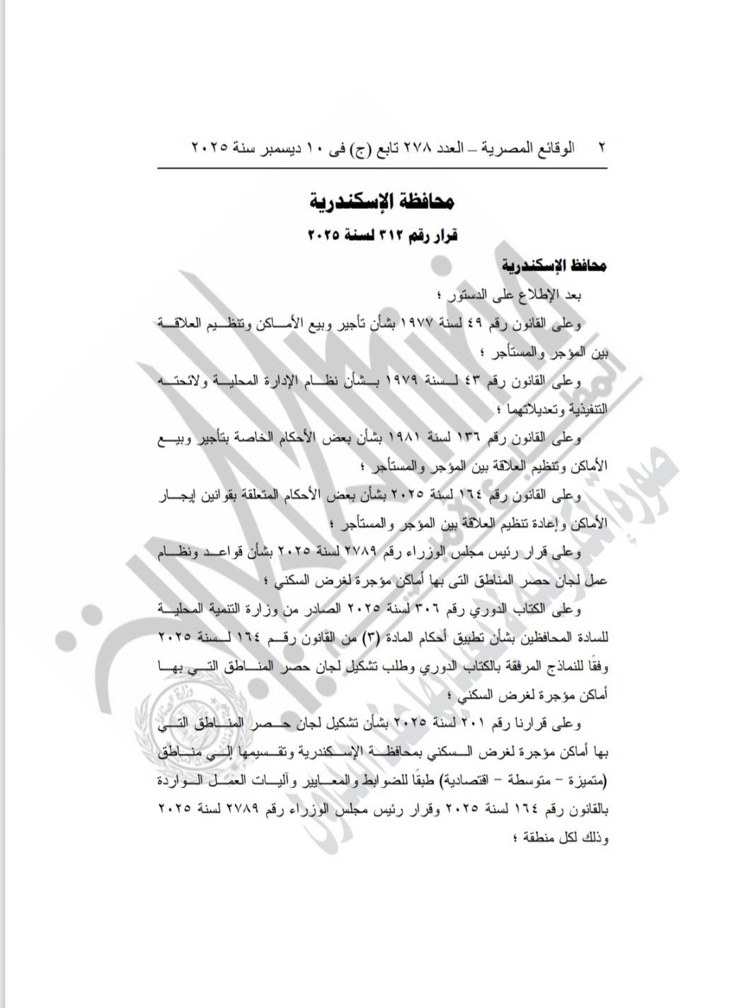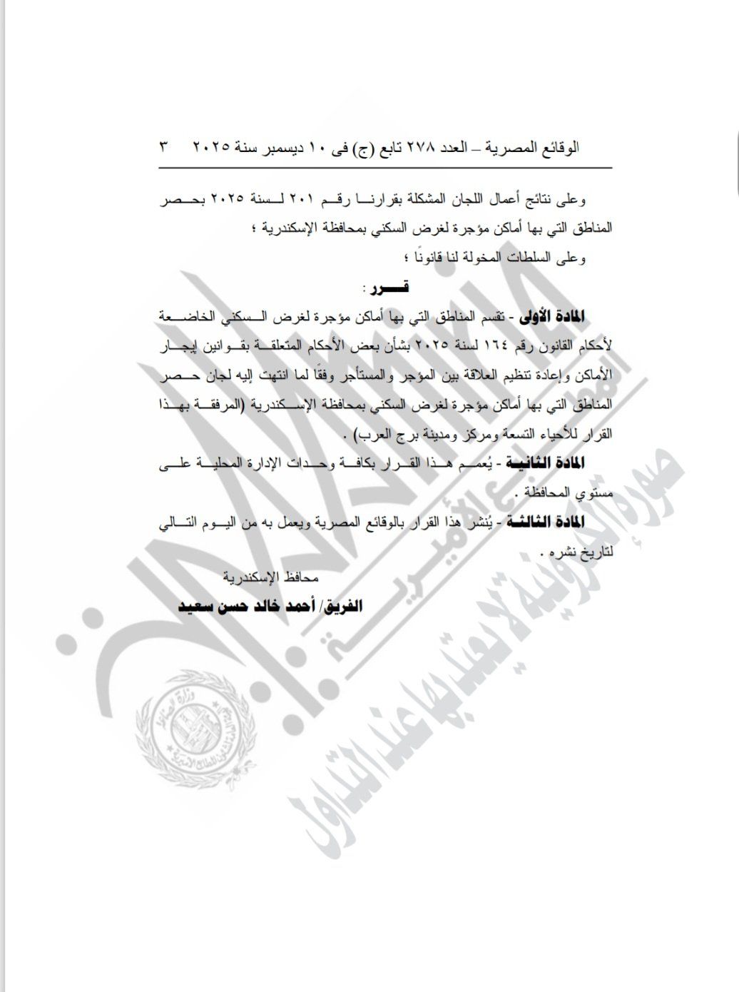 وصدرت نتائج أعمال اللجان المشكلة بقرار رقم 201 لسنة 2025 بحـصر المناطق التي بها أماكن مؤجرة لغرض السكني بمحافظة الإسكندرية كالتالى: