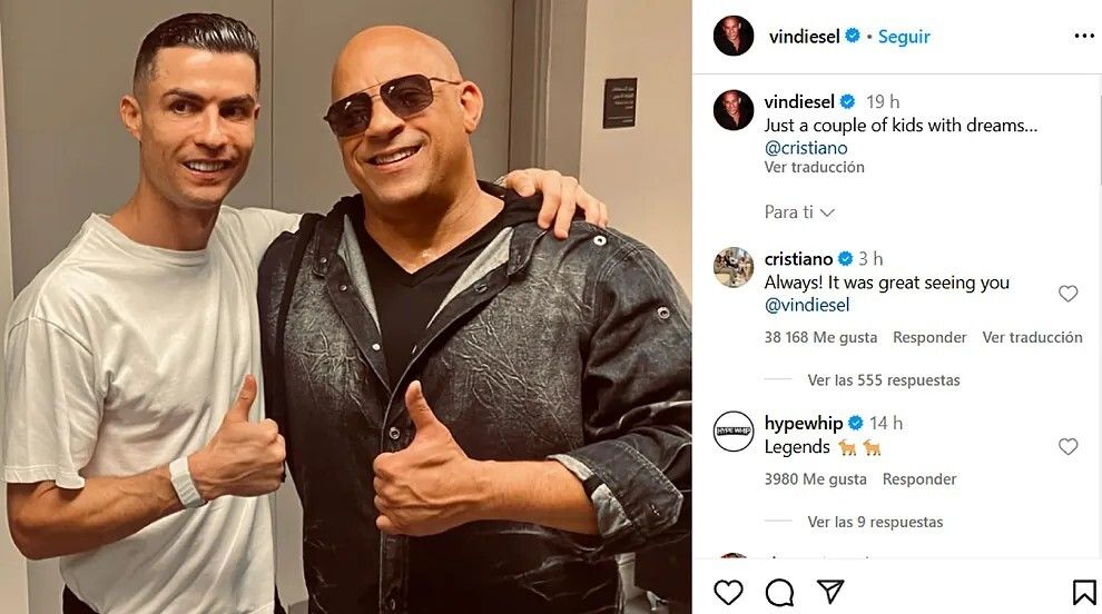 وظهر فان ديزل في صورة رفقة كريستيانو رونالدو وعلق عليها: "فقط طفلان لديهما أحلام كبيرة" ورد عليه نجم النصر قائلا: "كان من الرائع رؤيتك يا فان ديزل" وهو الرد الذي حصد أكثر من 38 ألف إعجاب ومن المتوقع أن تصل الصورة إلى 3 ملايين إعجاب.