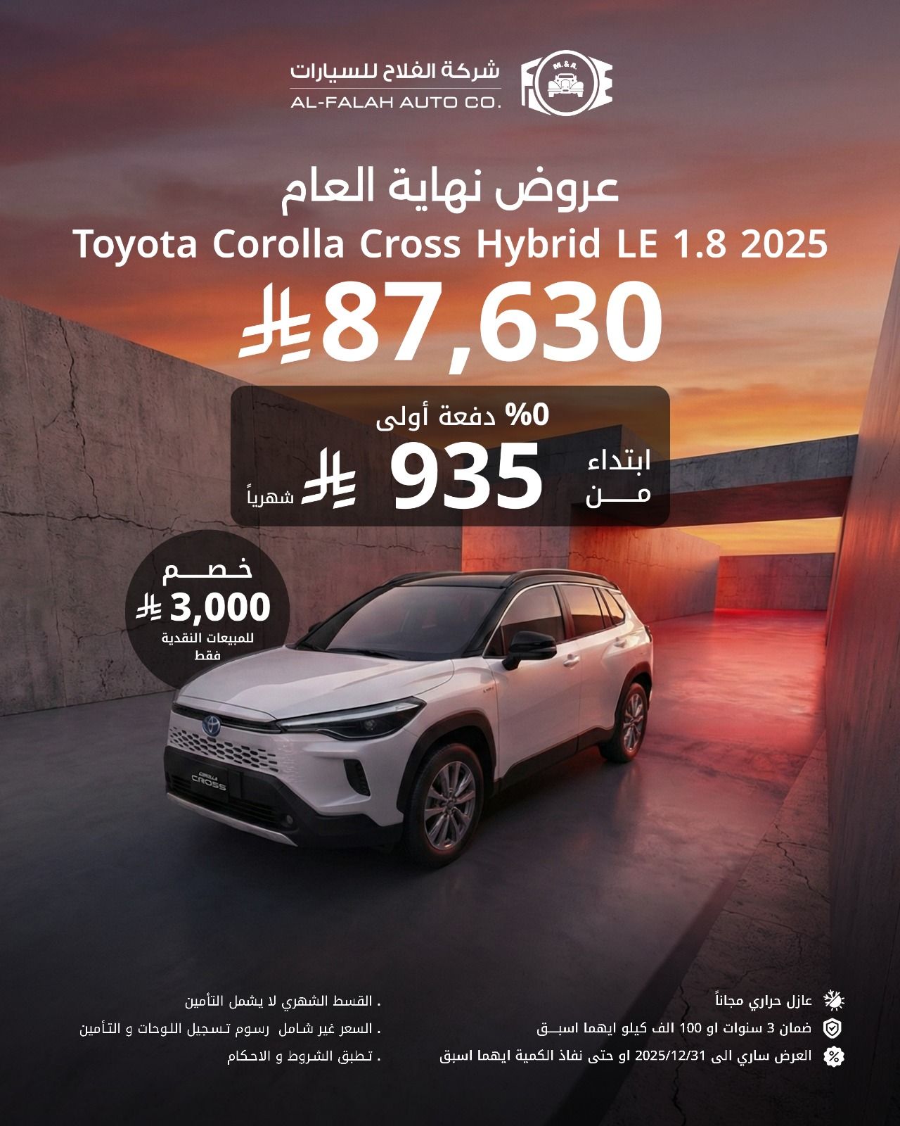 - سعر سيارة Toyota Corolla Cross LE Hybri كاش 87.630 ريال / التقسيط 935 ريال سعودي