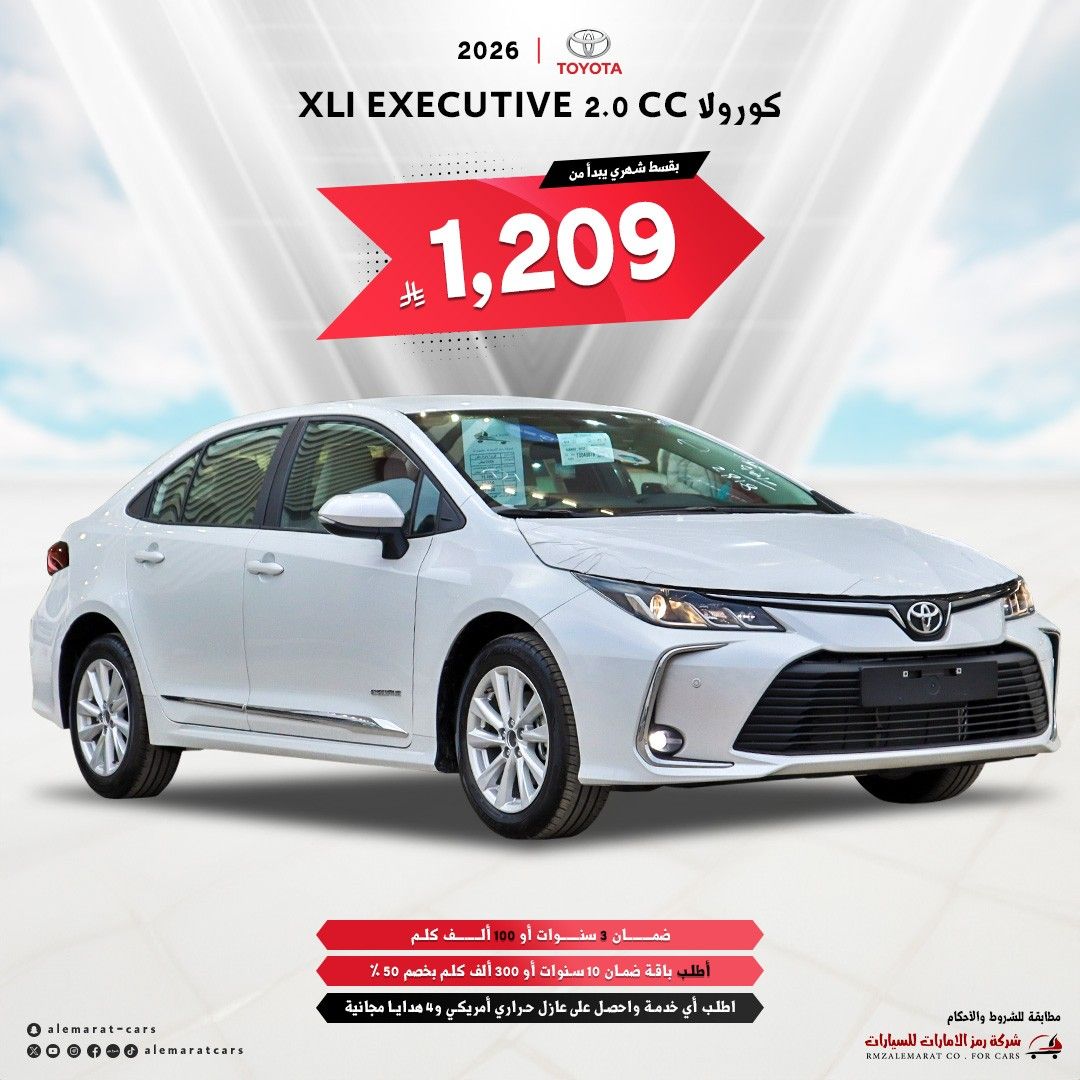 عروض شركة رمز الإمارات للسيارات على كورولا 2026 XLI EXECUTIVE 2.0 CC بأفضل الاسعار المنافسة و بقسط شهري ميسر لا تفوتوا افضل العروض