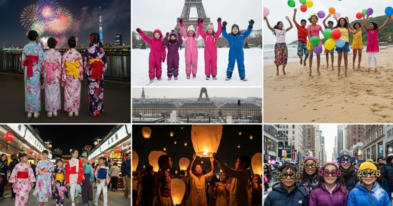 مع دقات الساعة منتصف الليل في كل أنحاء العالم، نتذكر الرغبة العالمية في البدء من جديد، والاحتفاء بالأمل، والتمسك بالمجتمع. فمن مهرجان الفوانيس في الصين إلى المعابد الرملية في كمبوديا، ومن الصلوات المبهجة في أوغندا إلى التماثيل النارية في غواتيمالا والعادات الإقليمية النابضة بالحياة في الهند، ينسج كل تقليد قصة صمود وتواصل وتجدد في الاحتفال، يمكن تعريف الأطفال أو الطلاب على هذا البلد، من خلال احتفالات يوم السنة الجديدة 2026 حول العالم معهم، ولأجلهم.