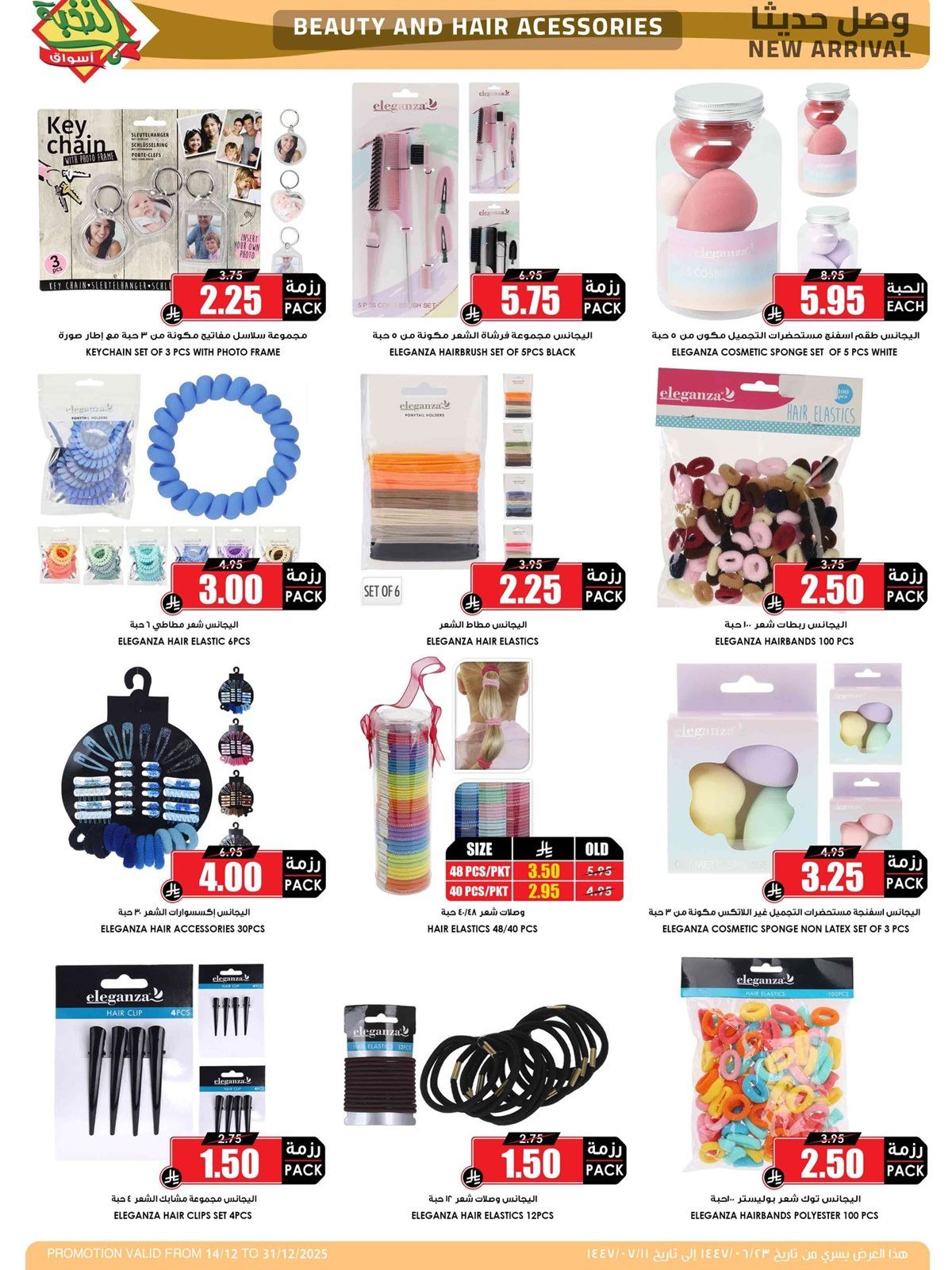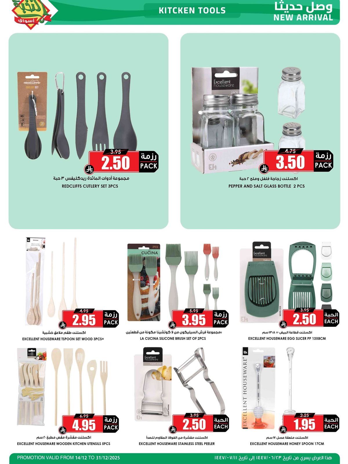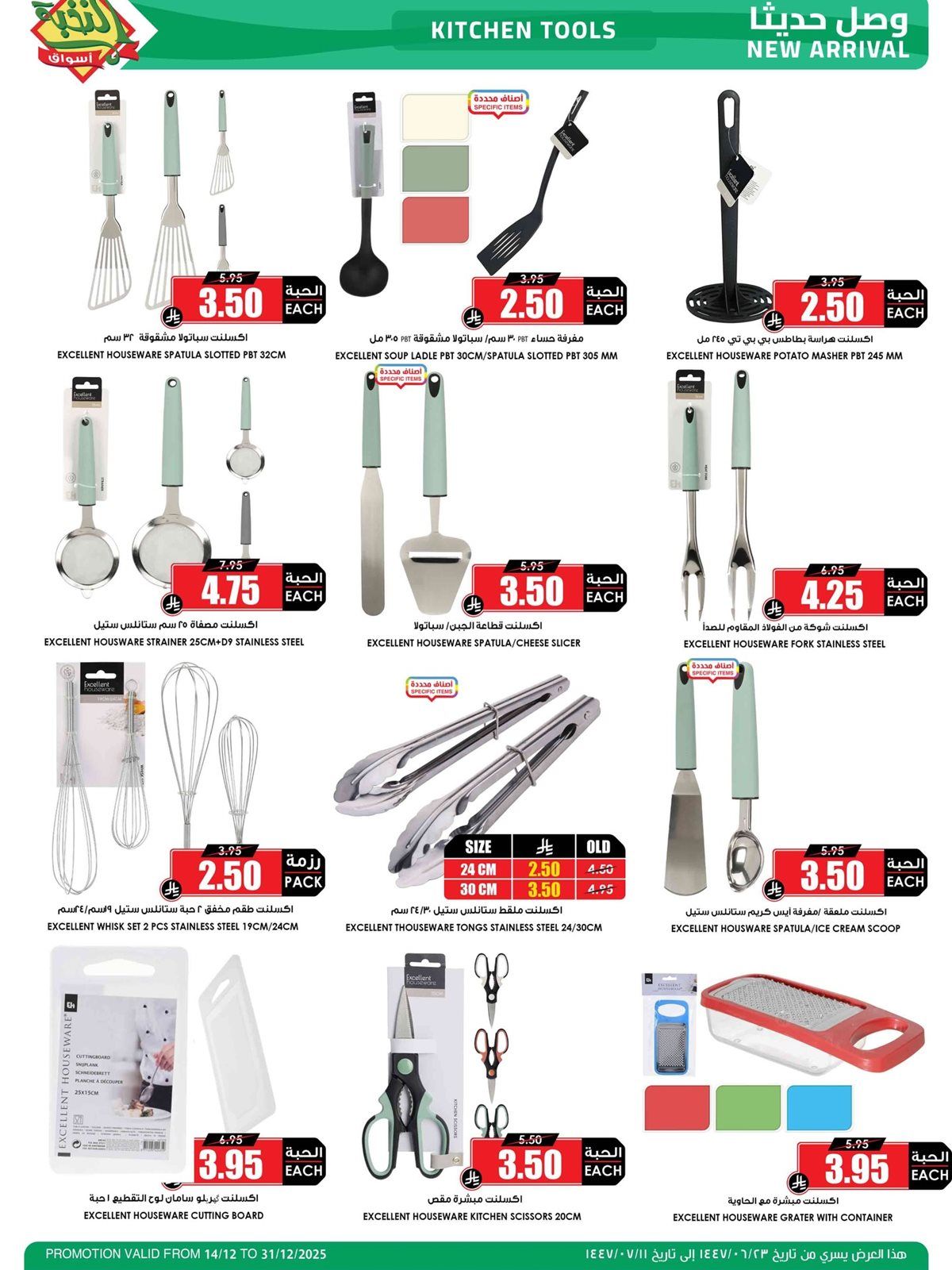 عروض اسواق النخبة الاسبوعية الاثنين 15-12-2025 تحتوي علي أدوات المطبخ العملية مثل أواني التحضير والملاعق الخشبية والمشابك المعدنية وأدوات التقشير والهرس والمضارب اليدوية مع تشكيلة من أدوات الحمام مثل فرش التنظيف والإسفنجات واللوحات الخاصة بالاستحمام ومستلزمات الغسيل والسباكة و غيرها من المنتجات باقل الاسعار
