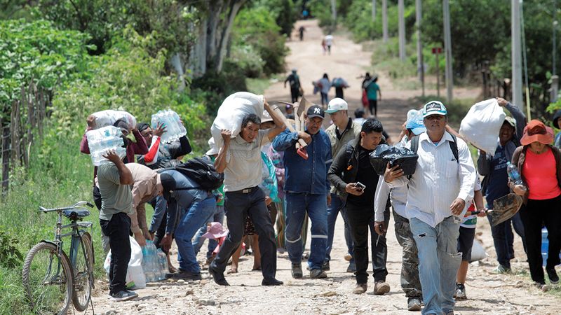 أشخاص يحملون مساعدات إنسانية بعد أن تعذّر عليهم العودة إلى منازلهم إثر فيضانات عزلت مناطق عدة في بوليفيا بعد هطول أمطار غزيرة في إل تورنو بمنطقة سانتا كروز.