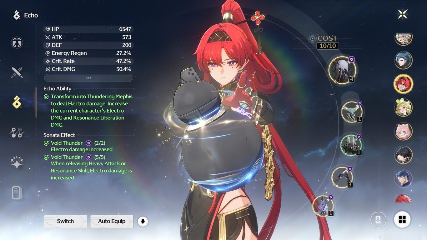 على سبيل المثال، تتيح قدرة Thundering Mephis التحول إلى هذا الكائن وإلحاق ضرر من نوع Electro، لكنها تُعد أيضًا جزءًا من مجموعة Void Thunder. عند تجهيز Echo ين مختلفين من مجموعة Void Thunder، يزداد الضرر من نوع Electro. أما عند تجهيز خمسة Echoes من المجموعة نفسها، فسيزداد هذا الضرر بشكل أكبر بعد تنفيذ الهجمات الثقيلة أو استخدام Resonance Skill.