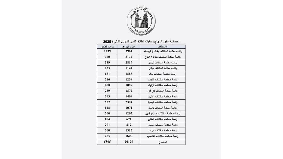 وذكرت إحصائية رقمية نشرها مجلس القضاء الأعلى في العراق، أن «مجموع عقود الزواج في عموم محافظات العراق، باستثناء محافظات إقليم كردستان العراق الثلاث (أربيل، السليمانية، دهوك)، بلغ 26129 عقداً».