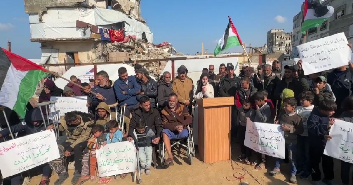 ورفع المشاركون لافتات تطالب بإدخال بيوت متنقلة كبديل عن الخيام، مؤكدين أن الخيام الحالية لا توفر الحد الأدنى من مقومات الحياة الكريمة.
