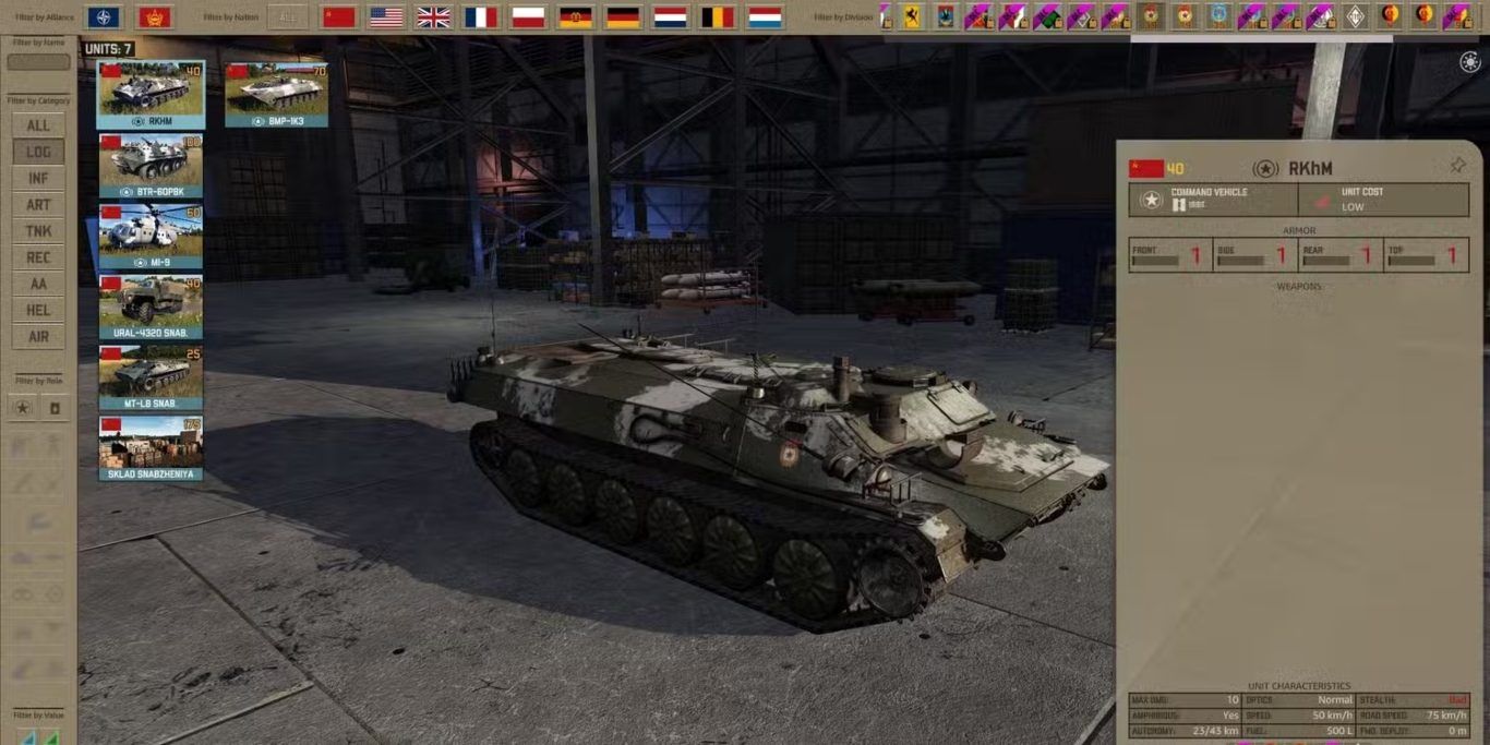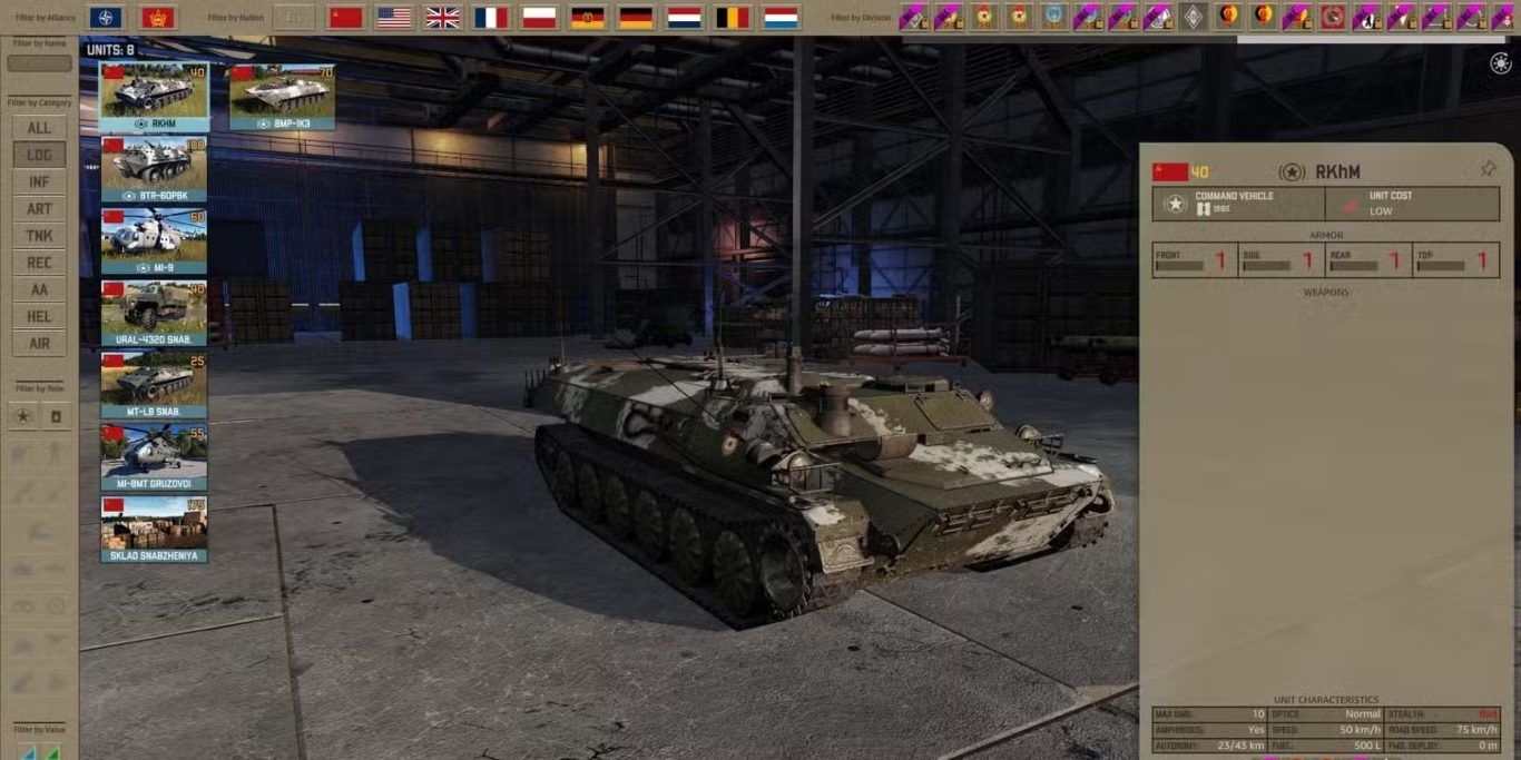 في فئة المدفعية، تقتصر الخيارات على مدافع الهاوتزر المخصصة للأهداف بعيدة المدى، بينما تُعد TOS-1 راجمة الصواريخ المتعددة الوحيدة المتاحة، والتي لا يمكنها استهداف أهداف تبعد أكثر من 3.5 كيلومترات. ومع ذلك، تُعد فئتا الدفاع الجوي والمروحيات مقبولتين، وتقدمان عددًا من الوحدات القادرة على أداء مهامها بكفاءة.