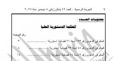 الخميس، 18 ديسمبر 2025 01:22 منشرت الجريدة الرسمية اليوم الخميس أحكام المحكمة الدستورية العليا بالجلسة العلنية المنعقدة يوم 6 ديسمبر برئاسة المستشار بولس فهمي إسكندر رئيس المحكمة، وعضوية المستشارين رجب عبد الحكيم سليم والدكتور محمد عماد النجار والدكتور طارق عبد الجواد شبل، وخالد أحمد رأفت دسوقي والدكتورة فاطمة محمد أحمد الرزاز، ومحمد أيمن سعد الدين عباس نواب رئيس المحكمة، وحضور المستشار الدكتور عماد طارق البشري رئيس هيئة المفوضين وعبد الرحمن حمدى محمود أمين السر.
