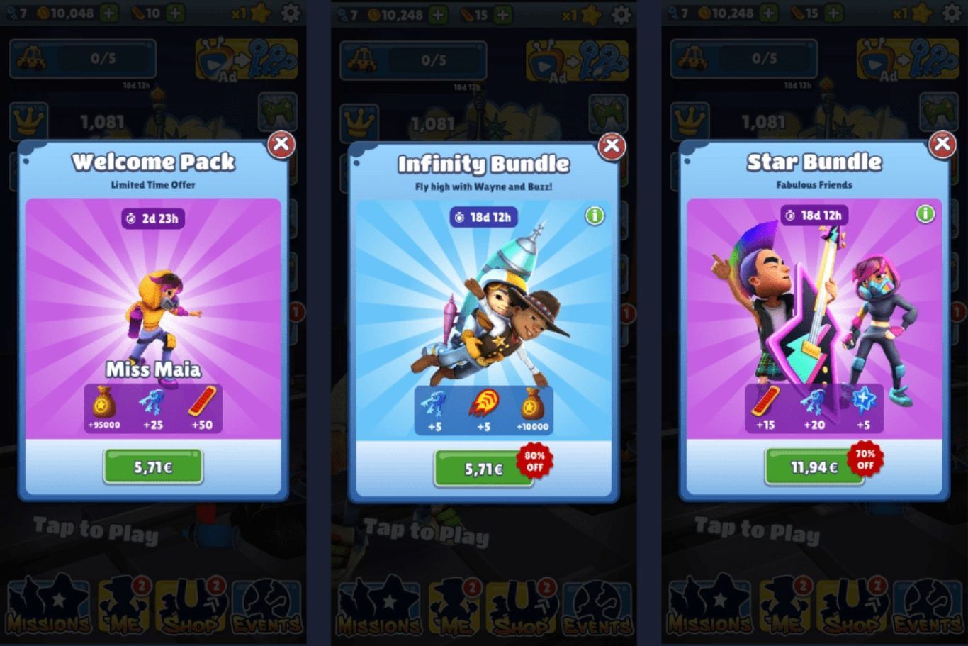 تعتمد Subway Surfers على مجموعة متنوعة من العروض لتحفيز اللاعبين على الشراء. تشمل هذه العروض حزم البداية المخصصة للاعبين الجدد، والتي تقدم مزيجًا من المفاتيح والعملات وشخصية أو لوح تحليق حصري. كما تُطرح حزم التخفيضات خلال فعاليات أو مواسم معينة، وغالبًا ما تتضمن كميات كبيرة من العملات إلى جانب عناصر نادرة أو فريدة.