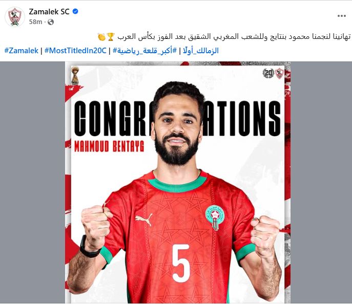 حرصت الصفحة الرسمية لنادي الزمالك على تهنئة لاعب الفريق محمود بنتايج، الذى شارك مع المنتخب المغربي بتتويج أسود الأطلس ببطولة كأس العرب.