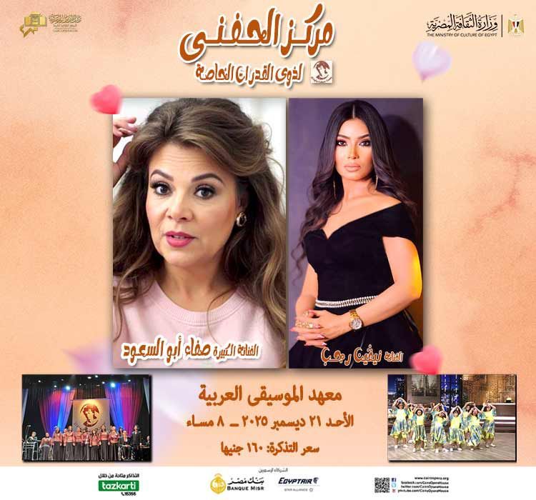تنظم دار الأوبرا المصرية برئاسة الدكتور علاء عبد السلام حفلاً لمركز الحفنى لذوى القدرات الخاصة بمشاركة النجمة صفاء أبو السعود والفنانة نيفين رجب وذلك فى الثامنة مساء الأحد 21 ديسمبر على مسرح معهد الموسيقى العربية.