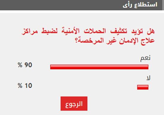 وأيد 90% من القراء مطالب تكثيف الحملات الأمنية لضبط مراكز علاج الإدمان غير المرخصة، بينما عارض 10% من القراء مطالب هل تؤيد تكثيف الحملات الأمنية لضبط مراكز علاج الإدمان غير المرخصة.